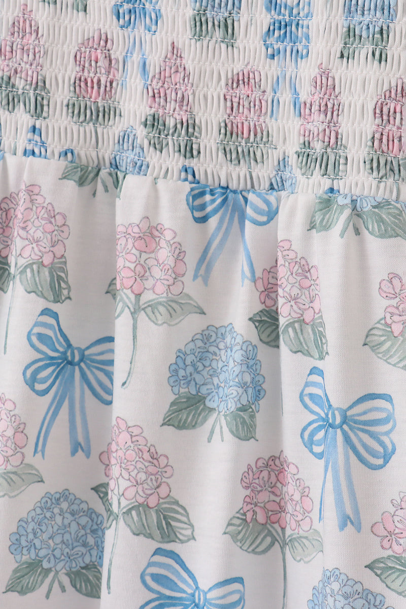 Double the cuteness with this smocked dress for mom and their mini-me! Featuring a beautiful blue hydrangea bow, this dress is perfect for family outings or special occasions. Bring some playful flower power to your wardrobe and match with your little one!
