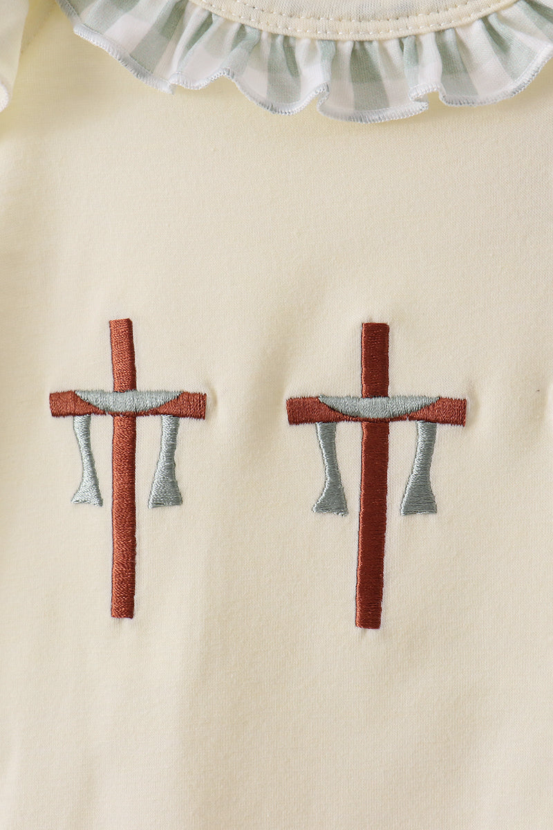 Adorable gingham shorts set featuring charming cross embroidery details and delicate ruffled edges. The playful green palette and classic gingham pattern make this a perfect pick for warm-weather adventures. Soft, breathable fabric keeps you comfortable all day long, while the coordinated set design offers effortless styling. Ideal for casual outings, playdates, or creating Instagram-worthy moments. A sweet addition to any wardrobe that celebrates fun, feminine style.