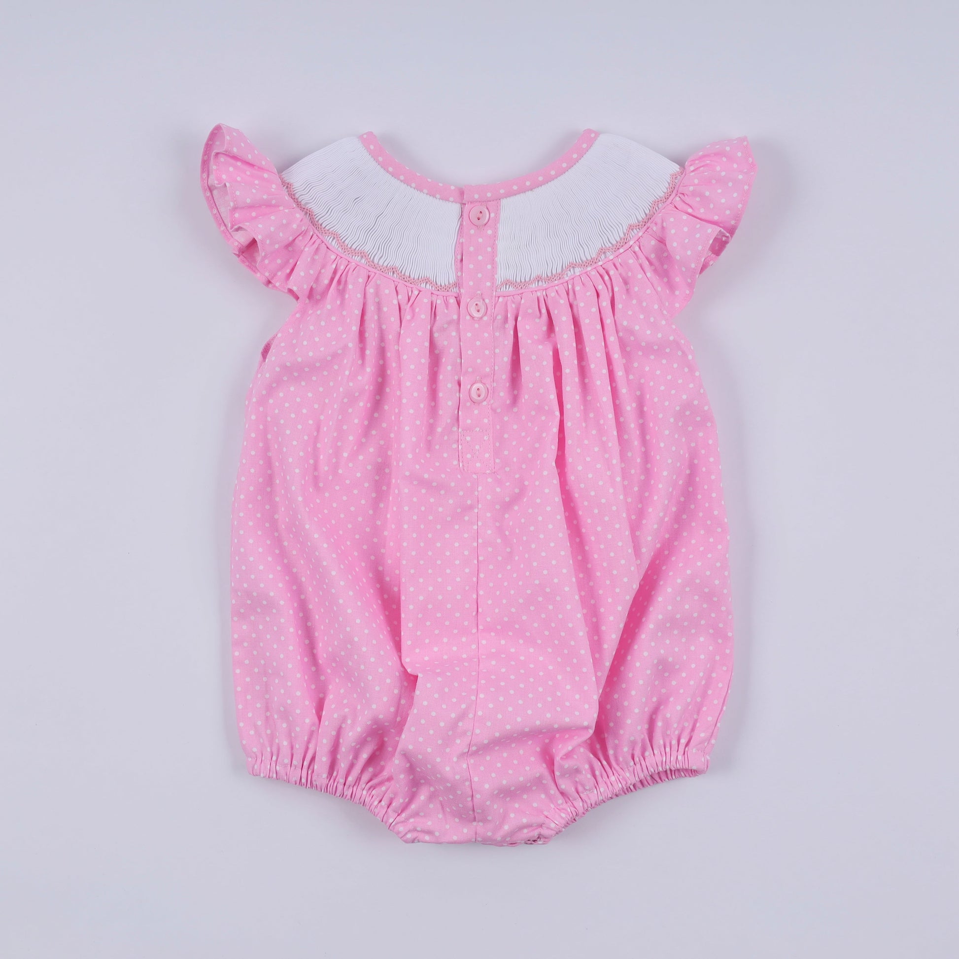 Pink character hand smocked dot ruffle bubble