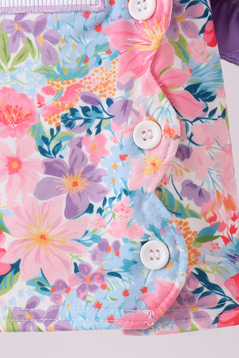 Daddy's little girl will love this adorable purple floral bloomer set! Featuring delicate smocked detailing and charming ruffled edges, this two-piece ensemble combines comfort with undeniable cuteness. The soft, breathable fabric keeps her cool and happy all day long, while the playful design makes getting dressed fun. Perfect for playdates, family photos, or everyday wear—this set is sure to become a favorite in her wardrobe.
