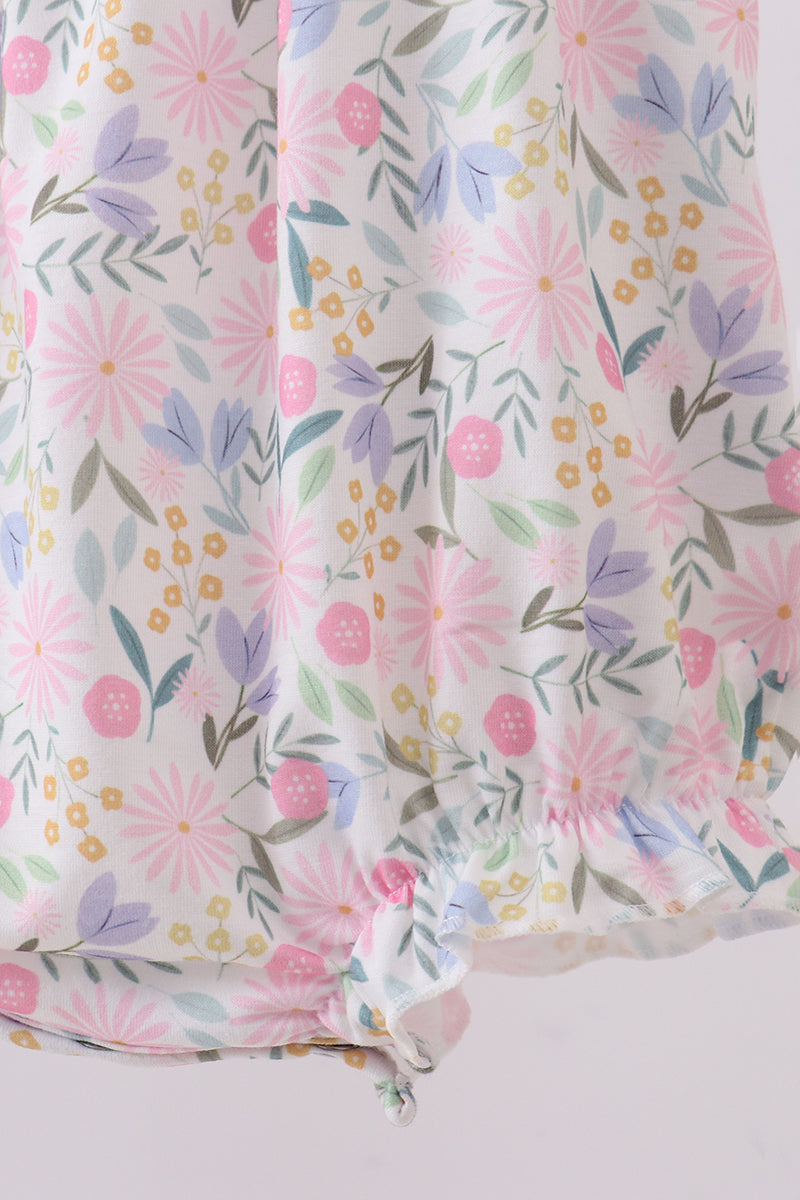 Twirl into springtime style with this charming purple floral bubble! Delicate smocking details and ruffled edges create a whimsical silhouette that's perfect for little ones who love to play and explore. The soft, breathable fabric keeps them comfortable all day long, while the cheerful floral print brings joy to any outfit. Whether it's playdates or family gatherings, this adorable bubble is sure to turn heads and spark smiles!