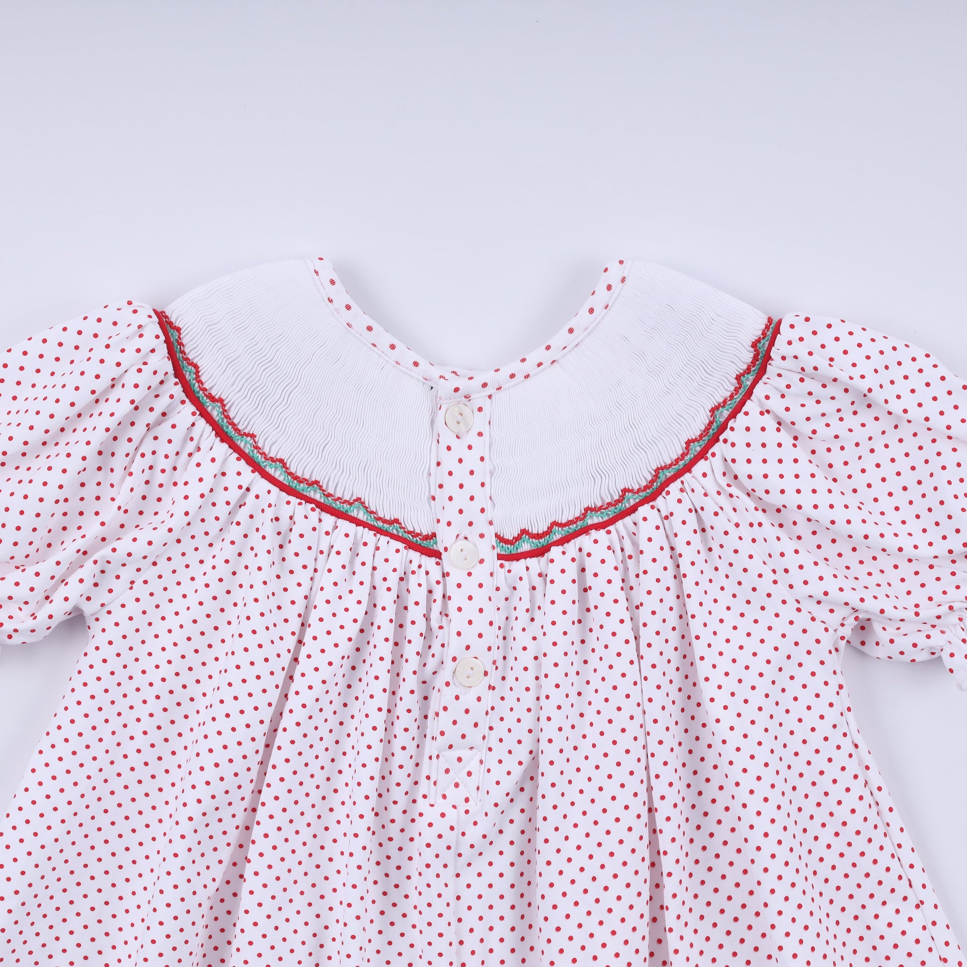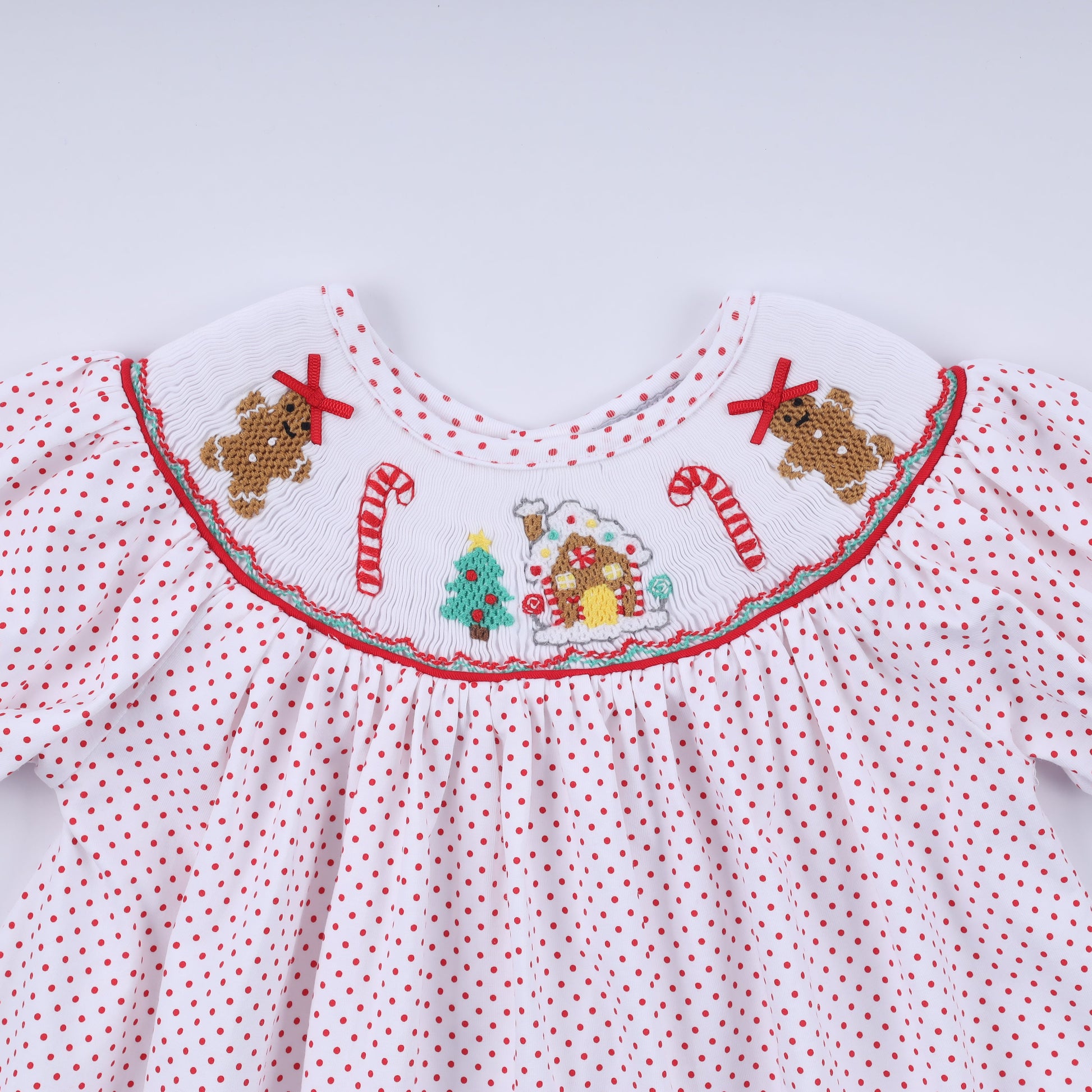 Adorable red gingerbread-patterned set featuring hand-smocked details and charming ruffle pants. Perfect for little ones who love festive style with a touch of whimsy. The smocked bodice adds texture and movement, while the ruffled pants create a playful silhouette that's as fun to wear as it is to look at. Ideal for holiday celebrations, special occasions, or everyday adventures with personality.
