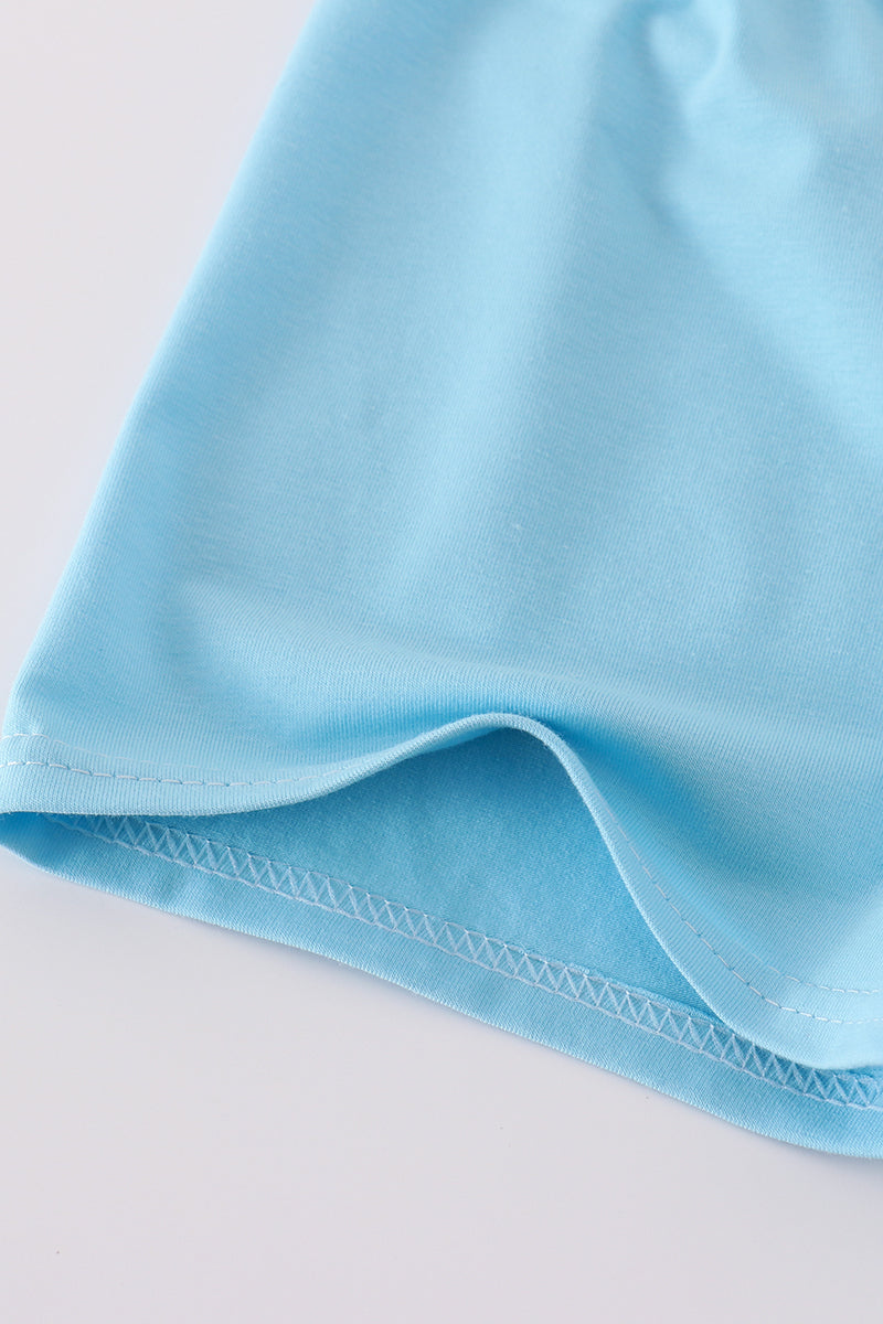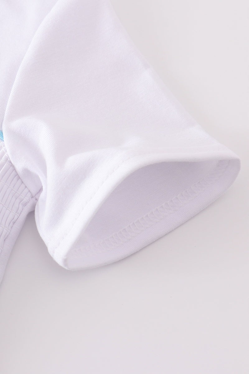 This playful smocked set is perfect for a day at the beach! Featuring white starfish embroidery, it adds a touch of whimsy to your summer wardrobe. The smocked design provides a flattering fit while the lightweight fabric keeps you cool and comfortable. (Be the star of the shore in this charming set!)